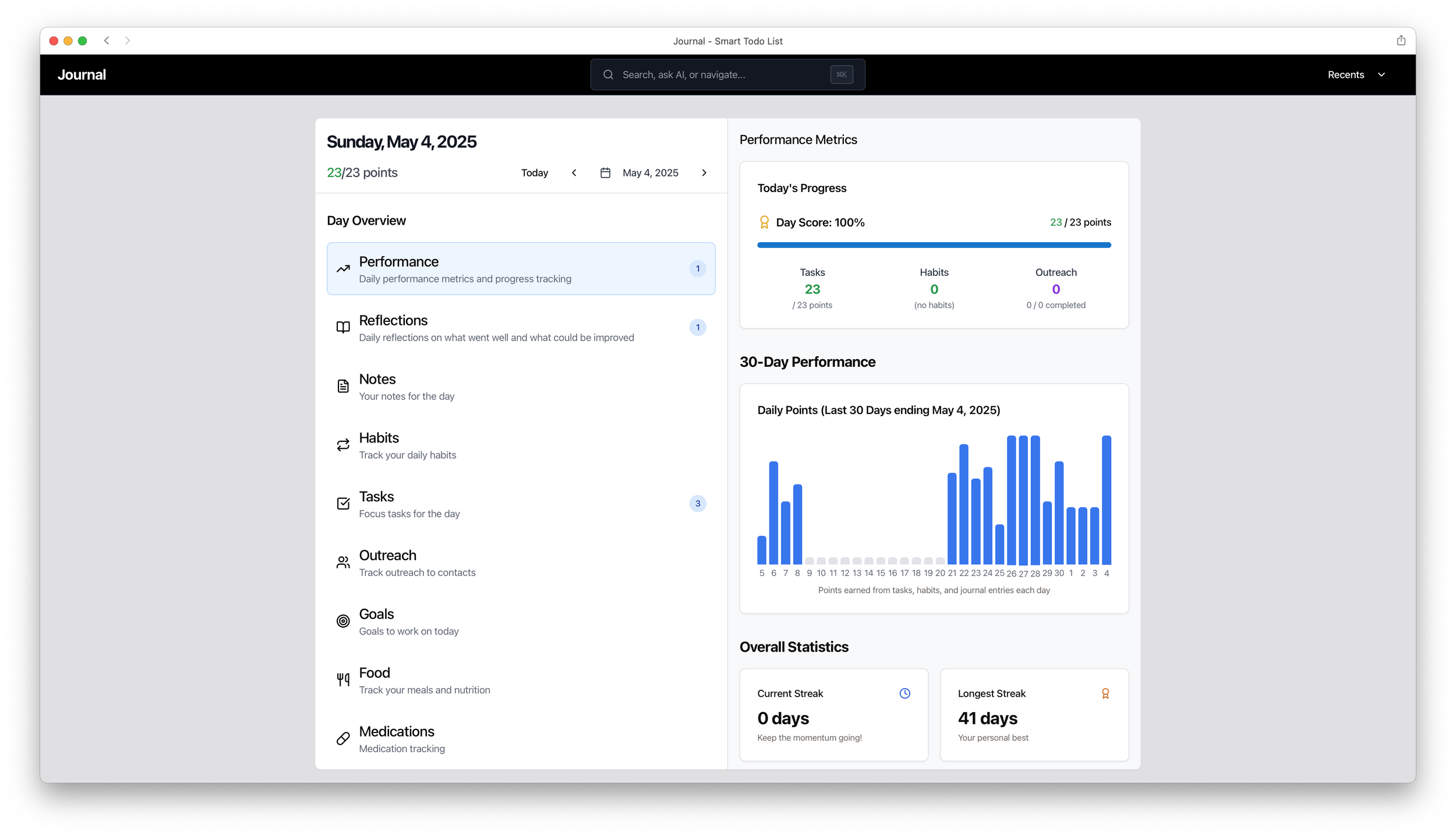 Most productivity apps are siloed: one for tasks, another for food, another for notes or mood. None of them help you see how your habits, thoughts, and actions are connected. The result? Fragmentation, blind spots, and a lack of real personal insight.